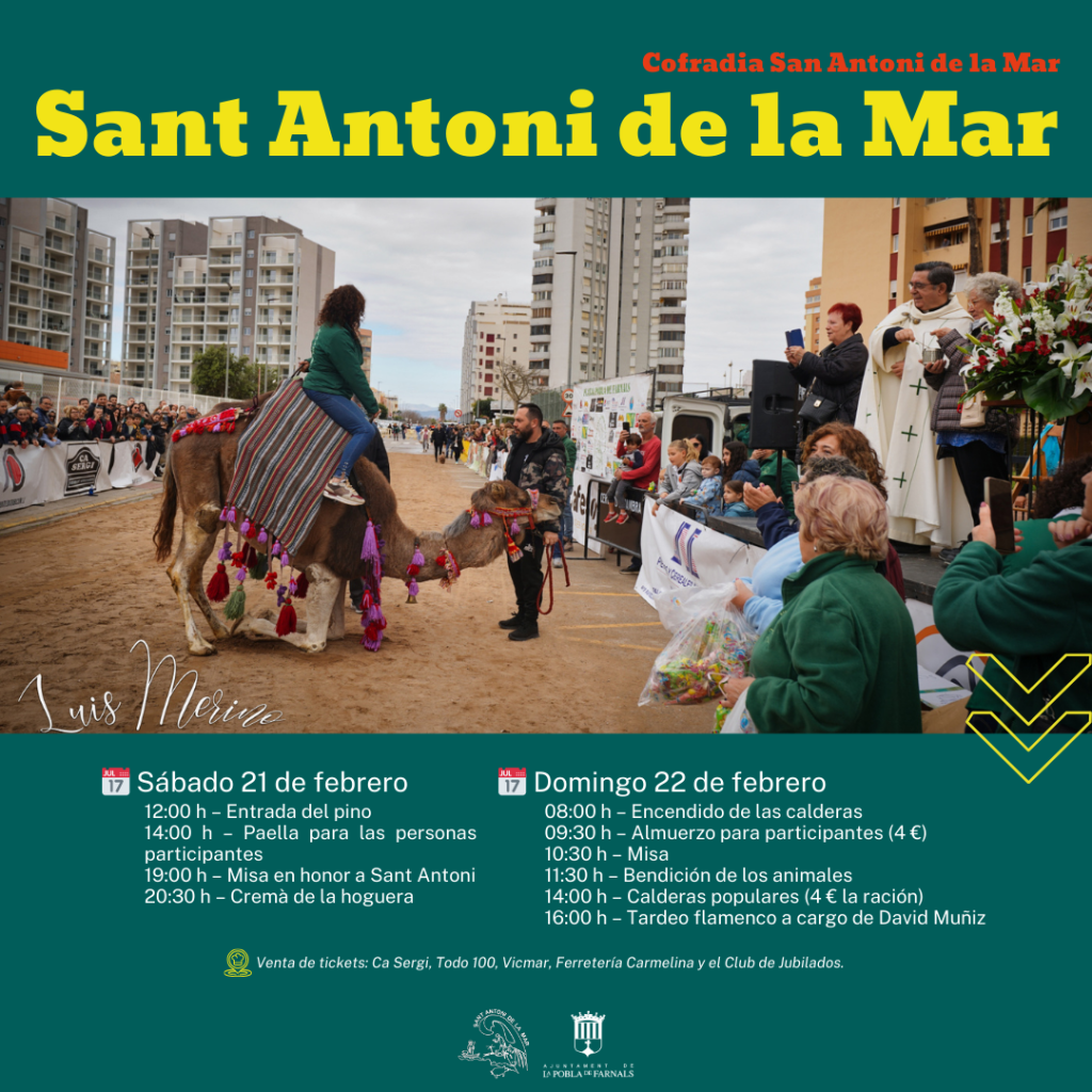 La Pobla de Farnals maakt zich opnieuw op voor een van haar meest emblematische weekenden met de viering van Sant Antoni de la Mar in het strandgebied, op 21 en 22 februari. De festiviteiten worden georganiseerd door de Cofradía de Sant Antoni de la Mar, onder leiding van Sergi Saborit en María José García, in samenwerking met de gemeente La Pobla de Farnals.
